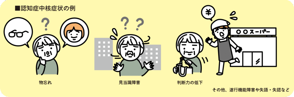 中核症状(認知症そのものの症状)には、「記憶障害」「見当識障害」「理解・判断力の低下「実行機能障害」「失語」「失行・失認」などがあたります。